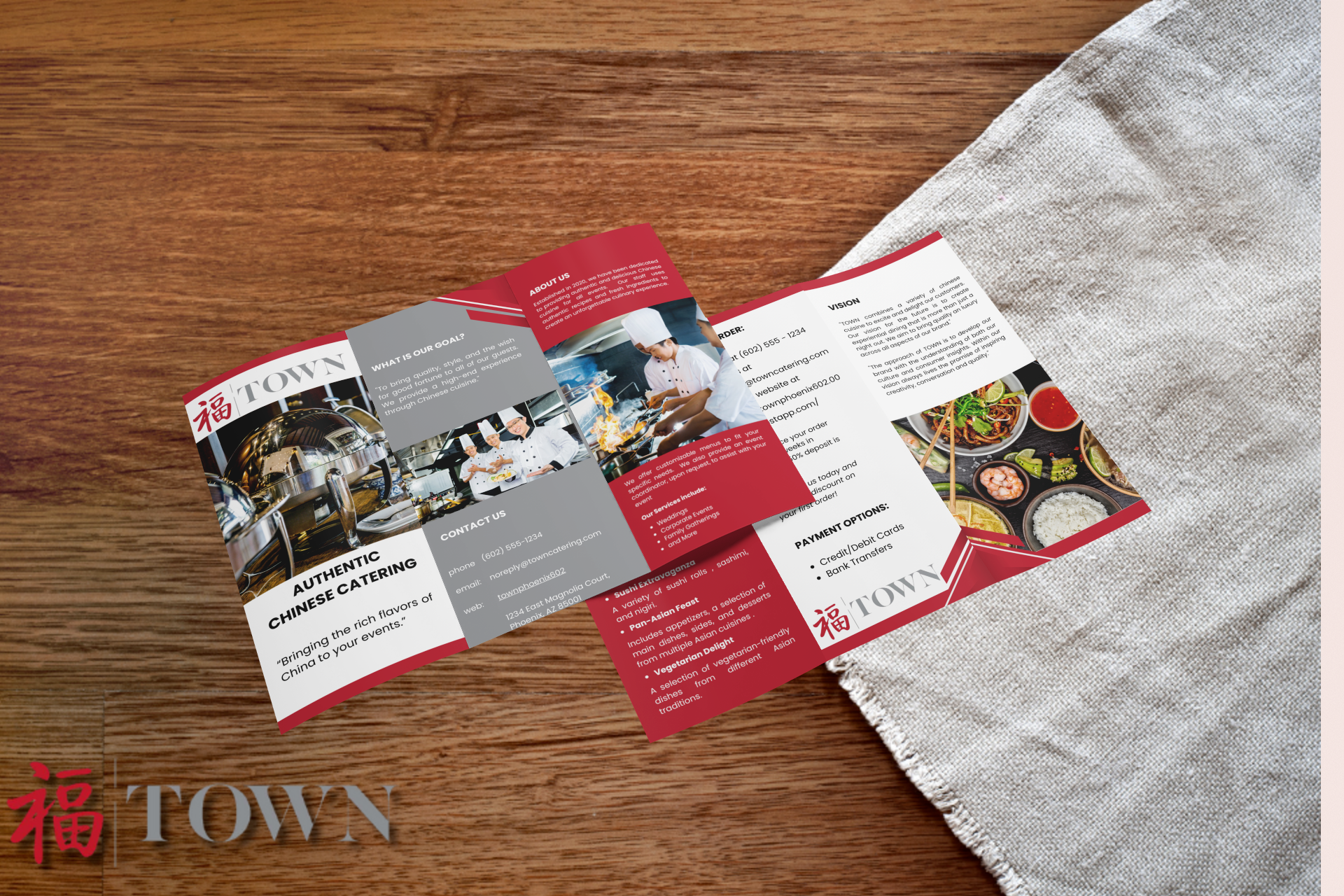 An informative catering brochure for Town Asian restaurant involves showcasing the diverse and delicious offerings, highlighting the benefits of choosing Town Asian for catering, and providing clear and engaging information on how to place an order.